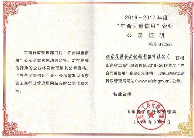 熱烈慶祝煙臺(tái)茂源食品機(jī)械制造有限公司獲得2016-2017年度“守合同重信譽(yù)”榮譽(yù)證書